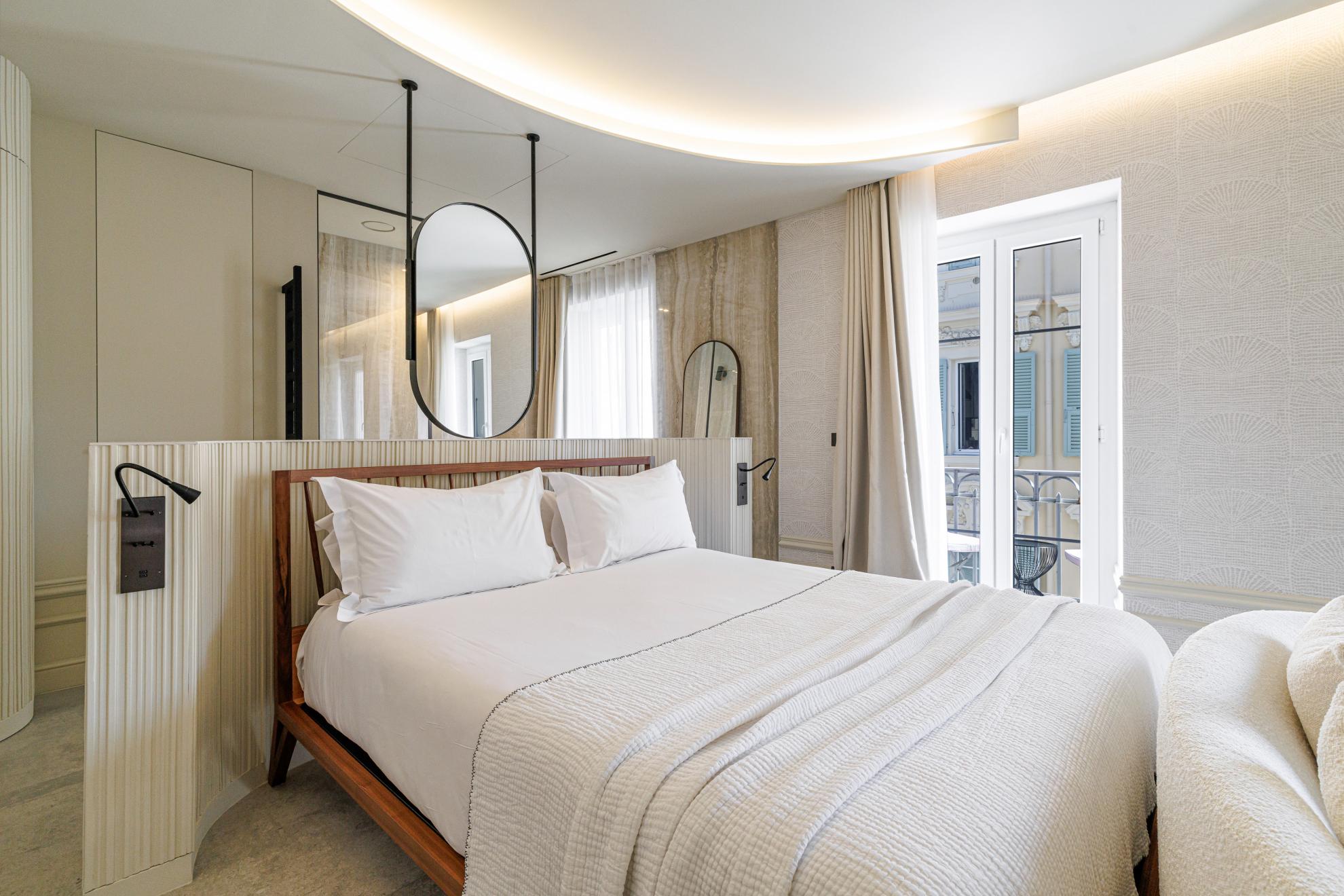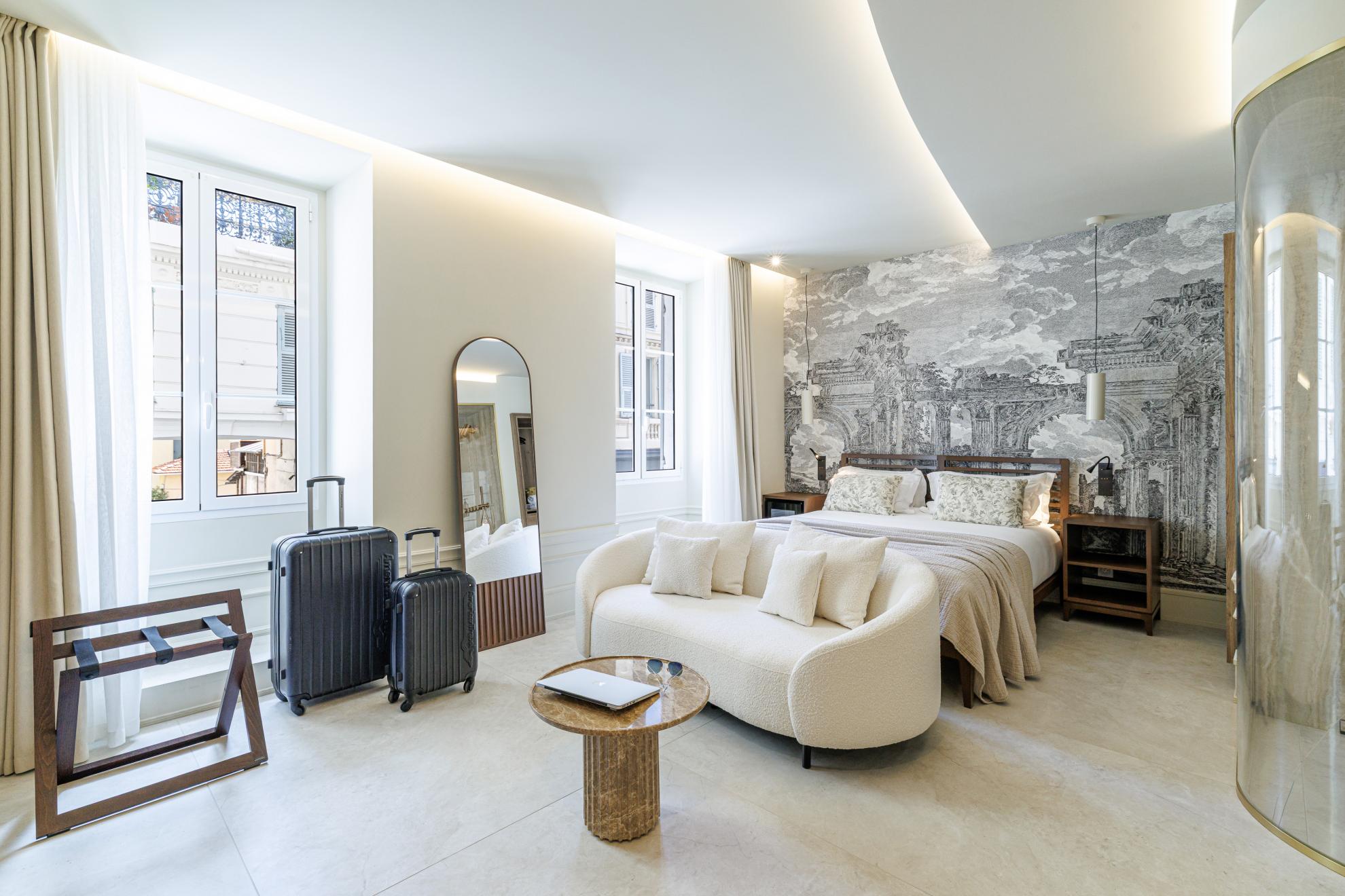 With their open-plan bathroom opening onto the bedroom, their view of the pedestrianised streets or the rooftops of Nice, they create a refined and comfortable setting in which to share an exceptional experience.